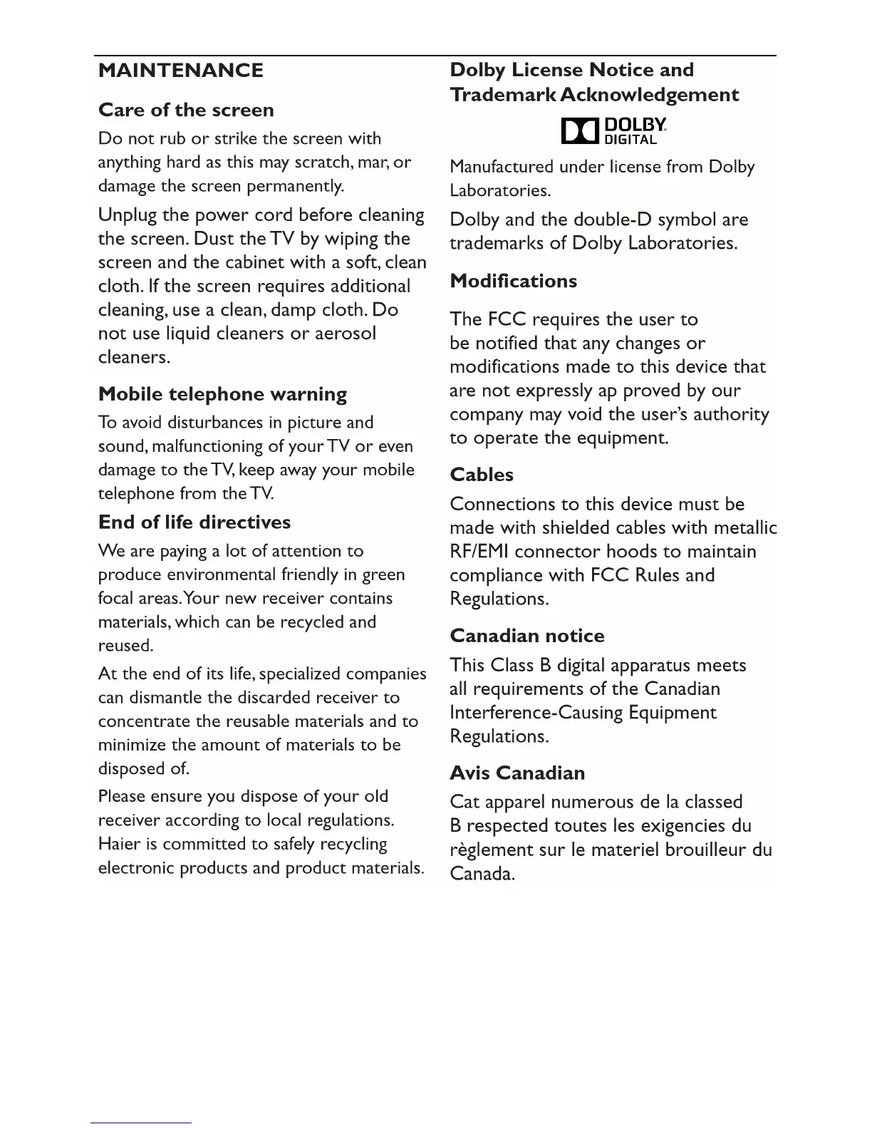 Haier 40D2500 - Maintenance and Compliance; Screen Care and Warnings; Environmental and Regulatory Notices