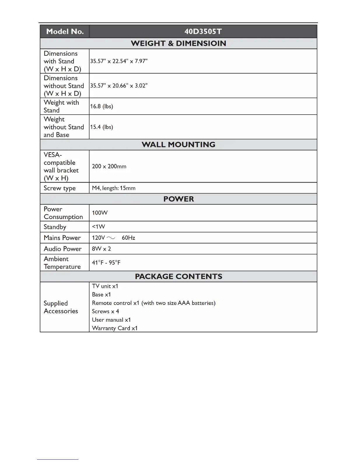 Haier 40D2500 - Weight, Dimensions, and Power; Physical Specifications; Wall Mounting Information; Power and Package Contents
