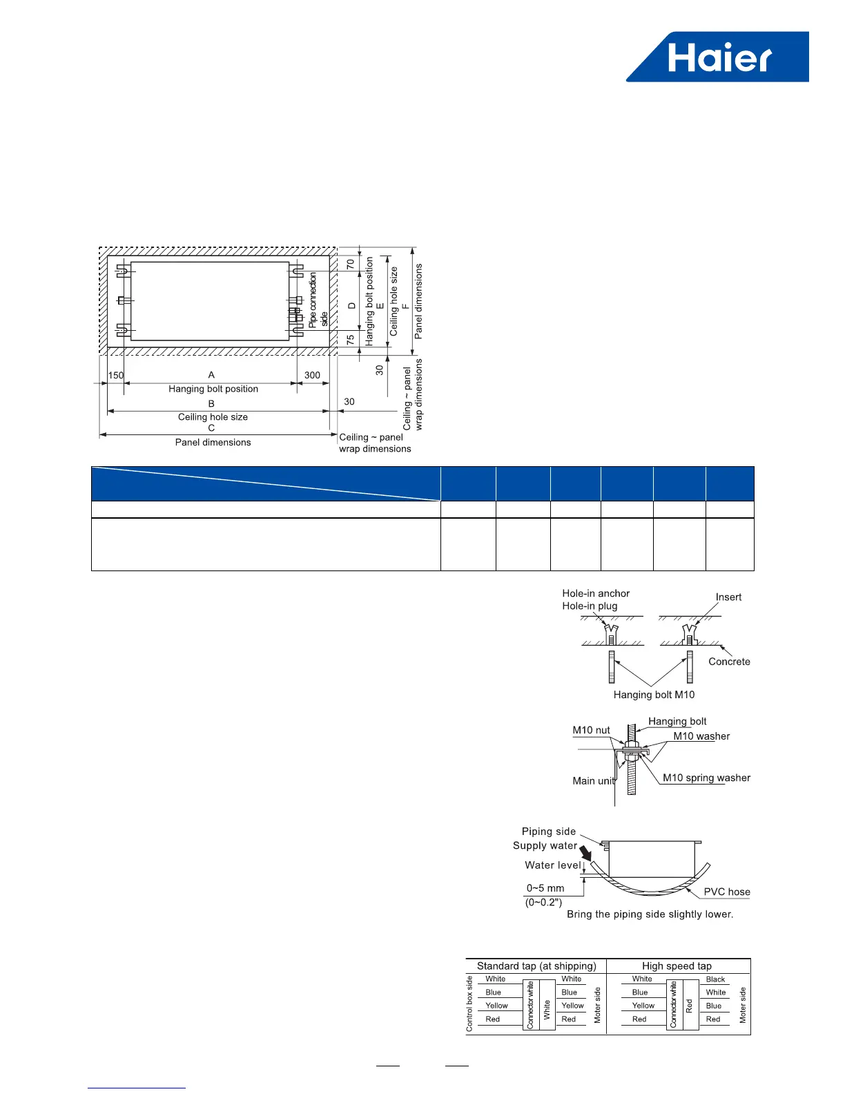 a. Size of hole at ceiling and position of hanging bolts