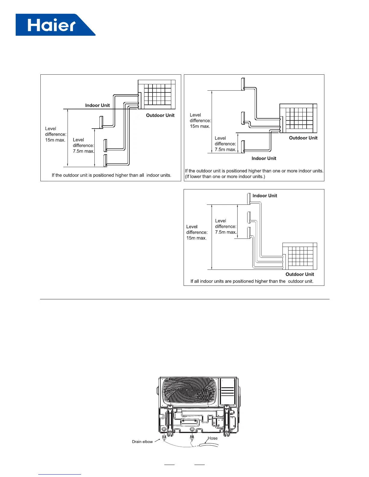 3) In cold areas, do not use a drain hose with the outdoor unit. (Otherwise, drain water may freeze, impairing