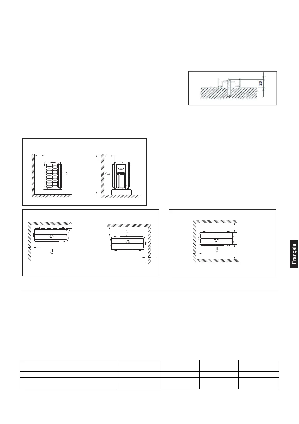 Pour tous les types d'installation ci-dessous, la hauteur de la paroi du côté échappement doit être de 1200 mm ou moins.