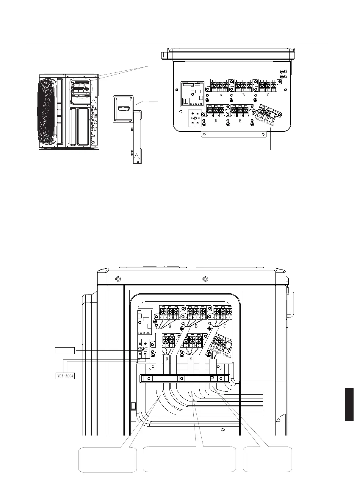 Solte a tampa de fio e conecte o cabo de alimentação e o cabo de comunicação da unidade interna ao terminal