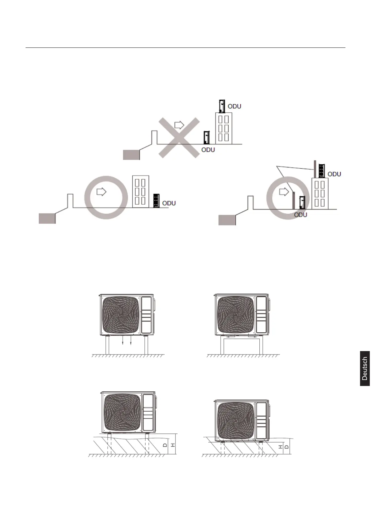 hinter einer Struktur (wie einem Gebäude) oder einer Schutzwand, die 1,5 mal höher als die Einheit ist, installieren, und 700 mm
