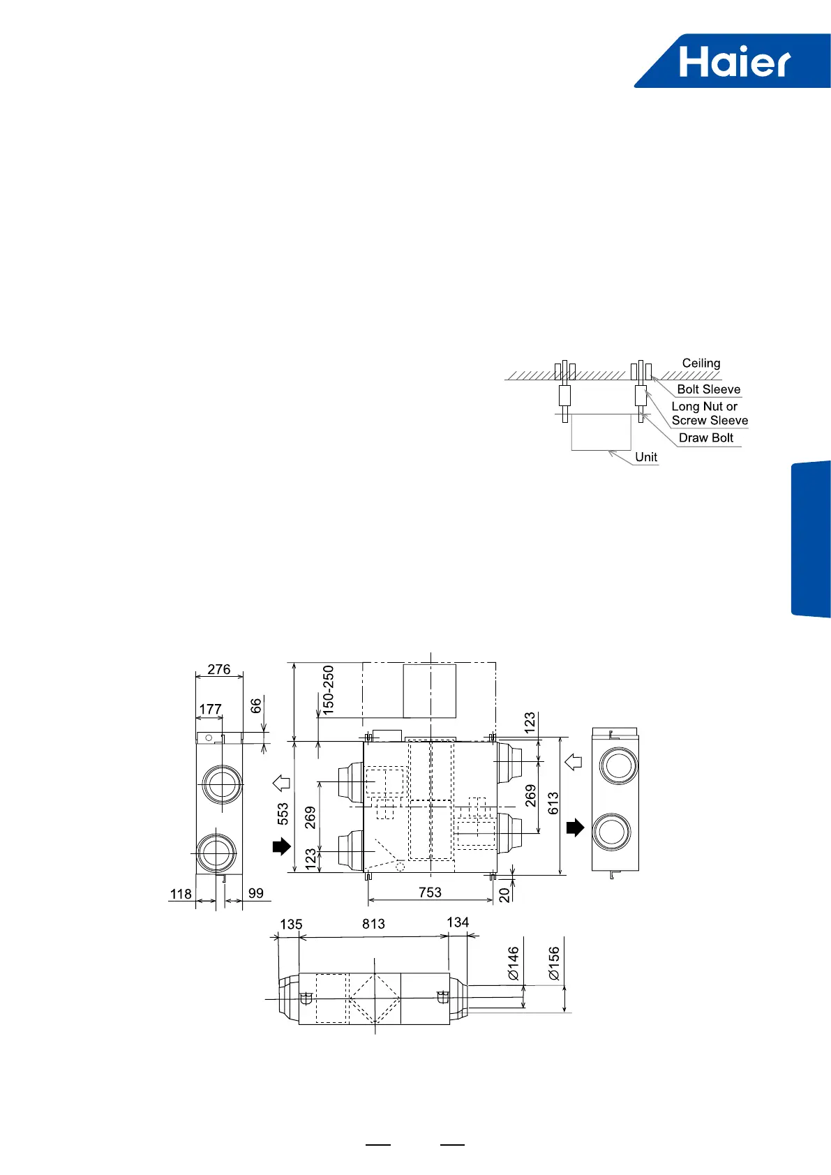 ■ Do not install the unit directly on roof or wall; otherwise, the unit may directly touch roof or vibration will ensue.