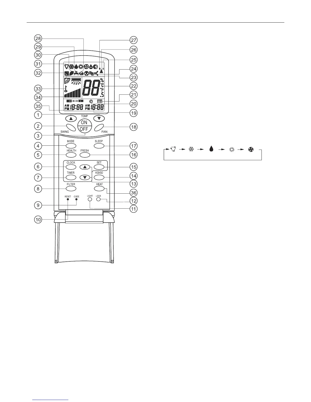 Teclas y display del mando a distancia YR-H71