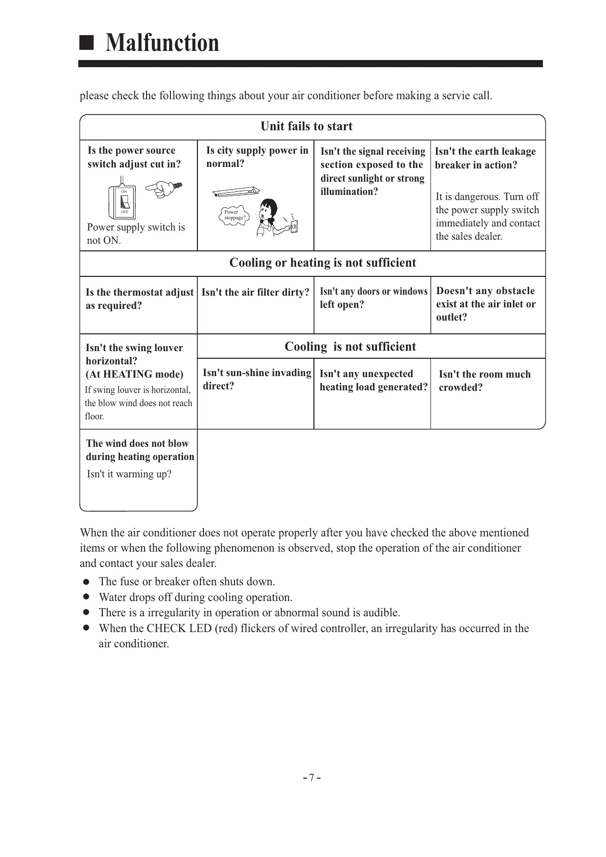 When the air conditioner does not operate properly after you have checked the above mentioned