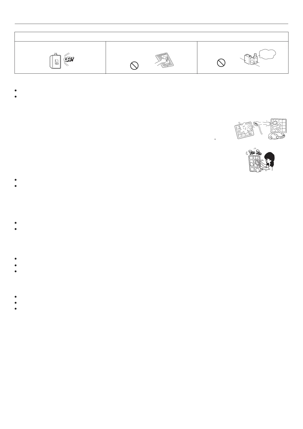 Turn off the power supply switch. Do not touch with wet hand. Do not use hot water or volatile liquid.