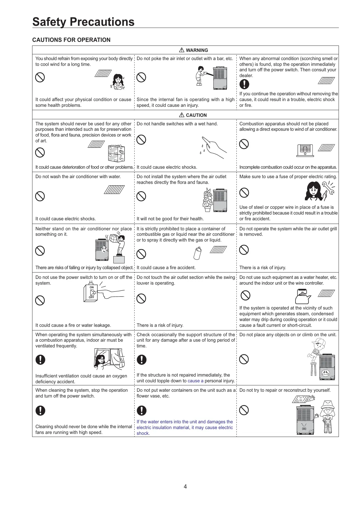 Do not wash the air conditioner with water. Do not install the system where the air outlet