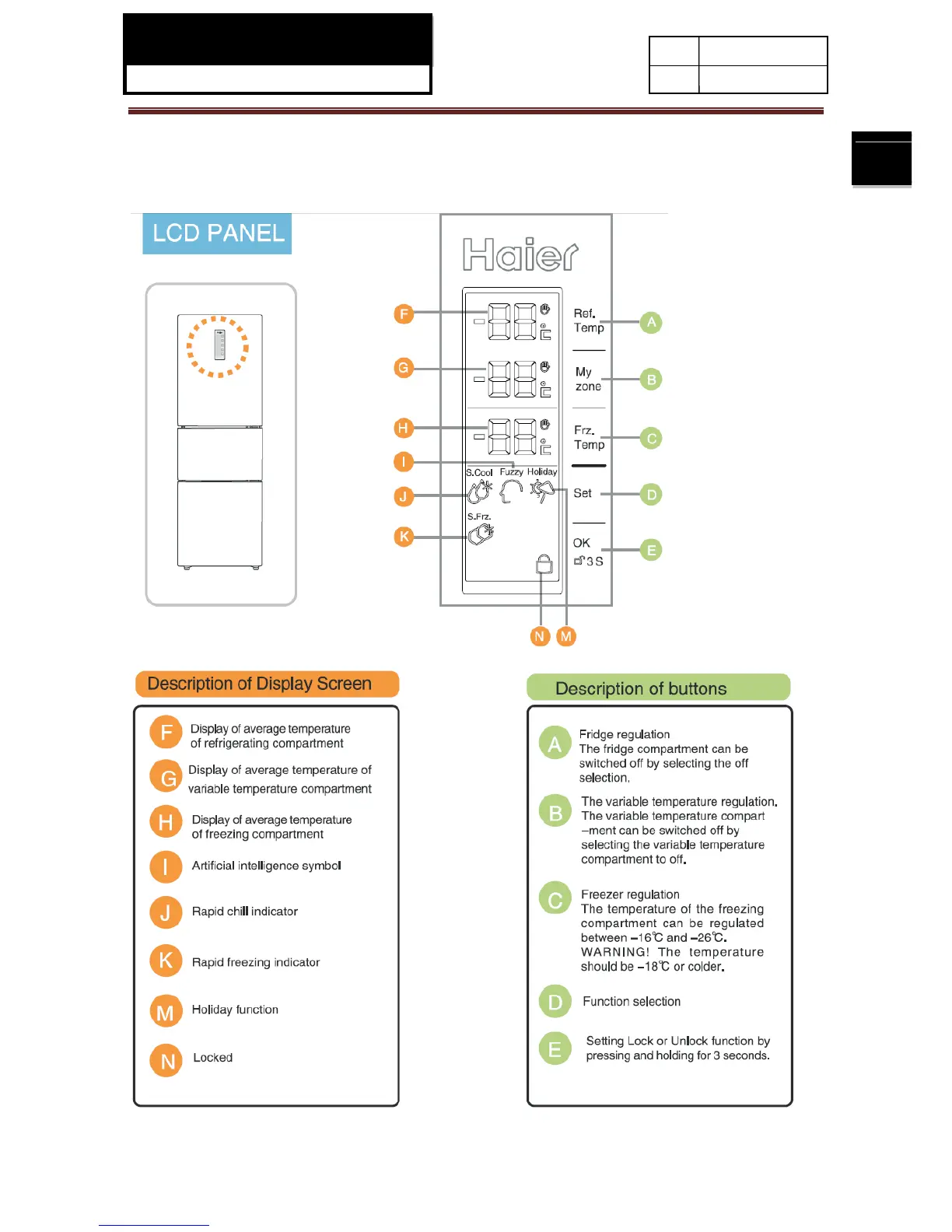 Haier AFD626TGW - Control and Display System; Control and Display Panel