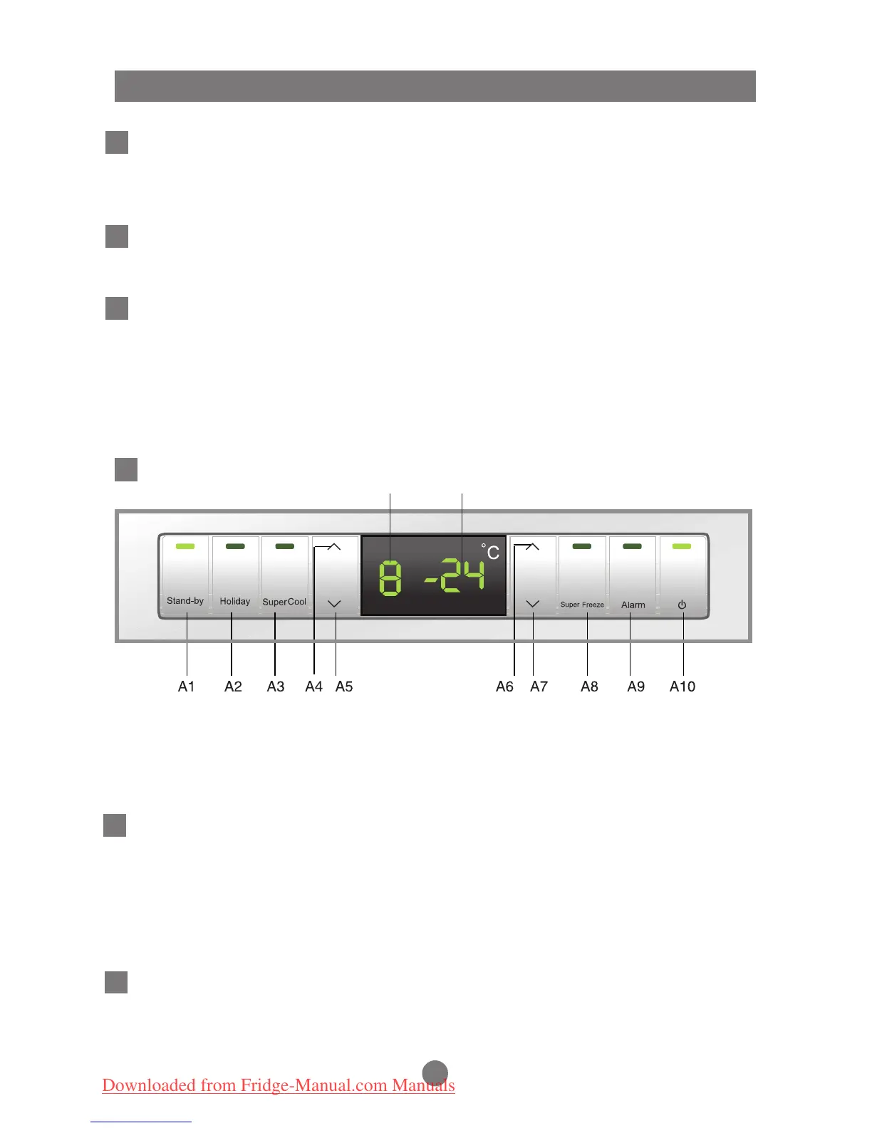 Press key A4 or A5 to set the fridge storage temperature. The fridge storage temperature cycles from