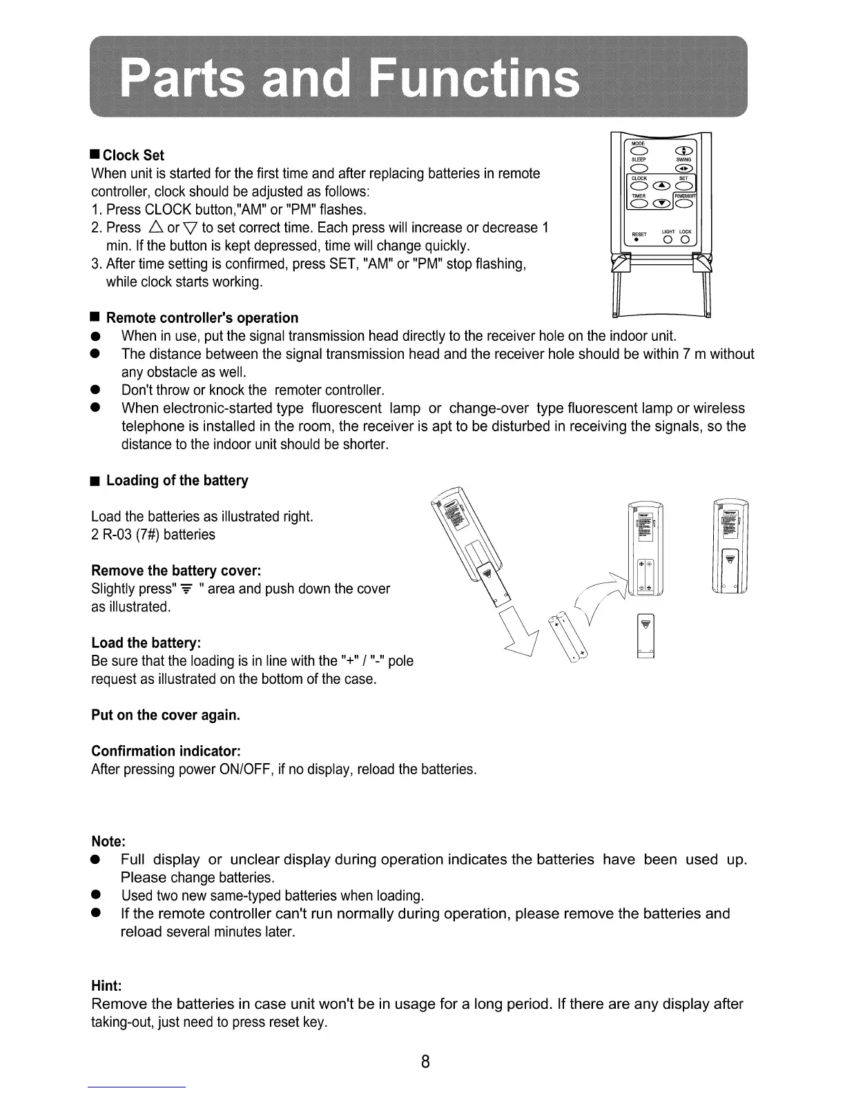 Haier AS142AHAIA - Remote Controller Setup; Setting the Clock; Battery Loading and Replacement