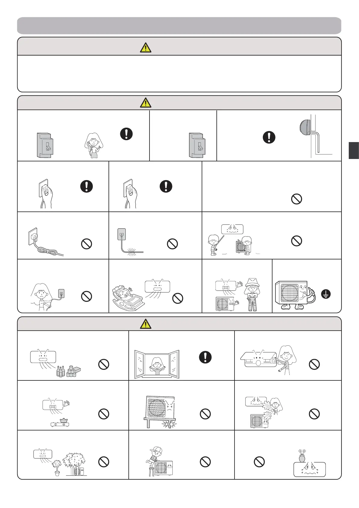 Do not attempt to install the air conditioner by yourself because improper works may cause electric shock, re,