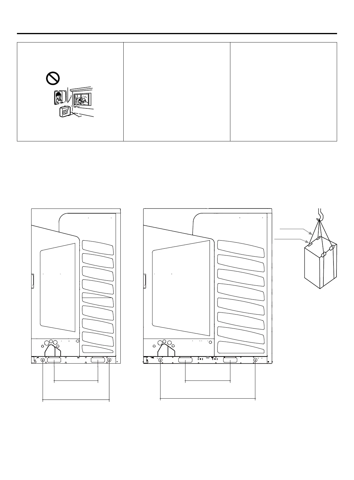 • Don't hang the unit only at two points. When hanging the unit, don't sit on the unit. The unit should be upright. When