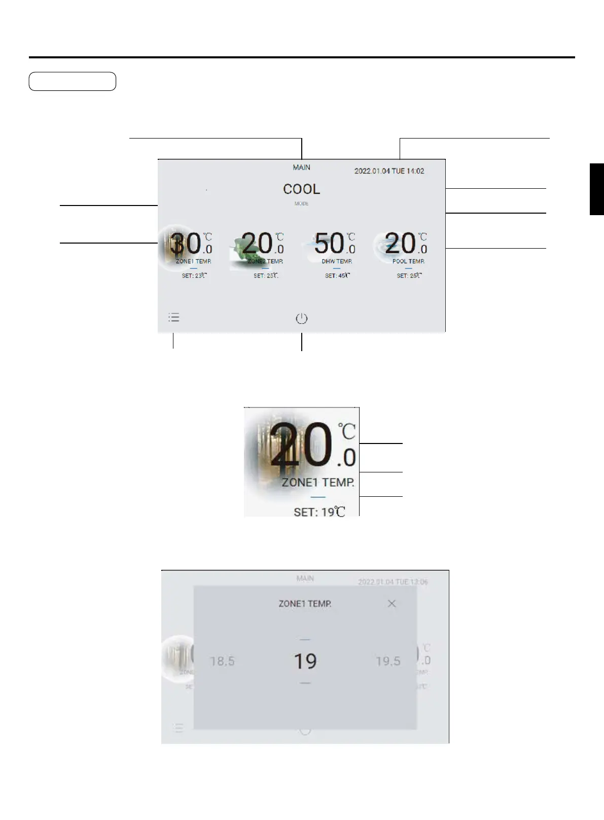 right to change the unit operation mode. Click each current temperature area and slide left and right to adjust the set