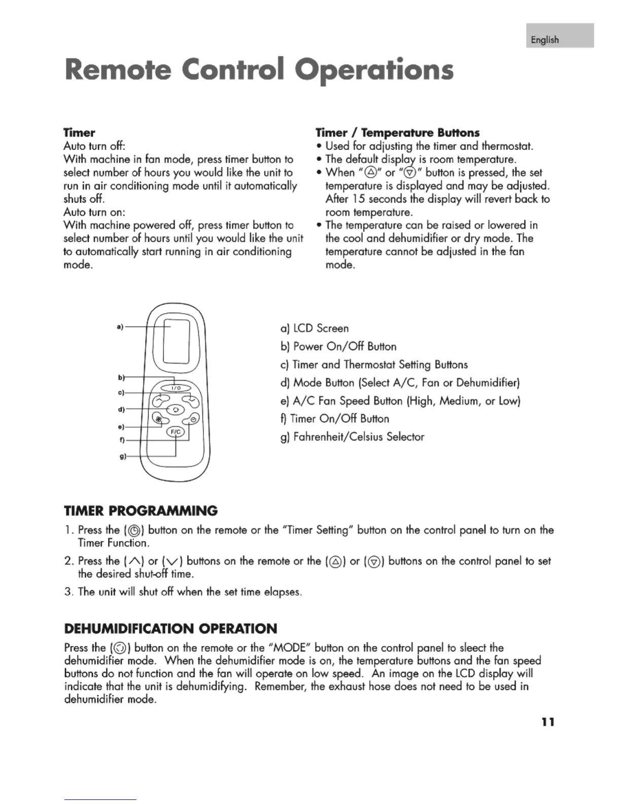 Haier CPRD12XC7 - Remote Control Operations; Timer Programming; Timer;Temperature Buttons; Dehumidification Operation