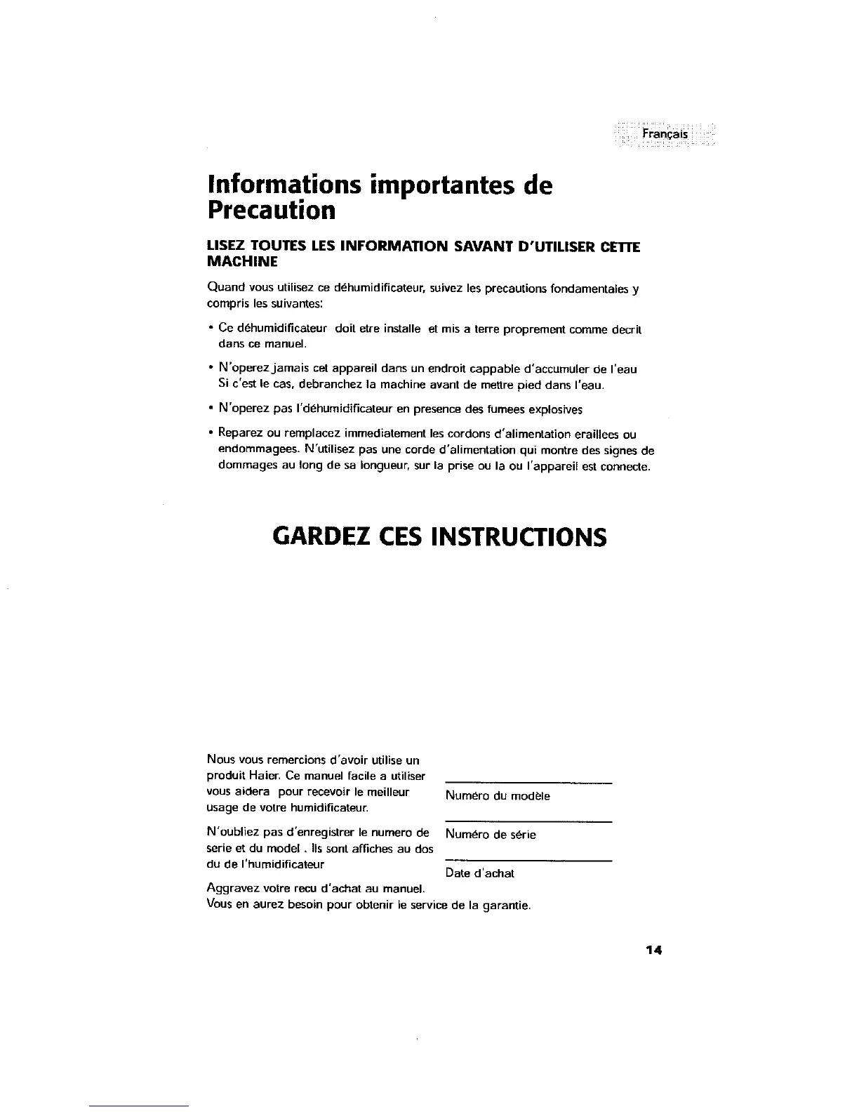 Quand voes utilisez ce d_humidificeteur, suivez les precautions fondamentales y