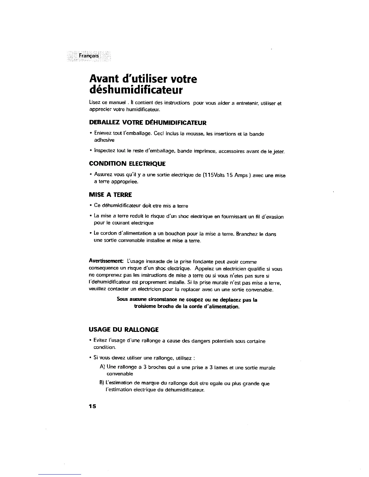 • Evitez I'usage d'une rallonge a cause des dangers potentiels sous certaine
