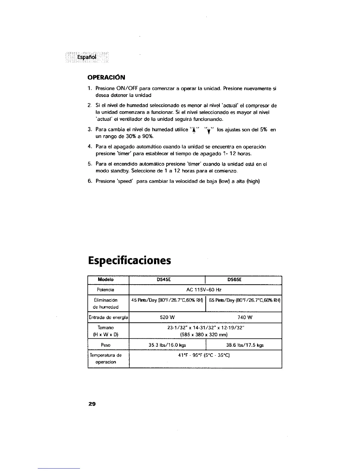 Eliminacion 45 Pints/Day (80°F/26.7°C,60% RH 65 Pints/Day (80°F/26.7°C,60% RH