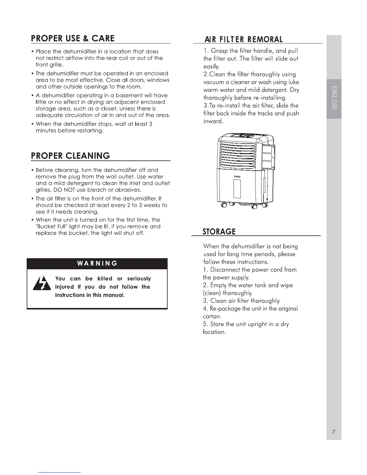 Haier DE45EK - Maintenance and Storage; Air Filter Servicing; Unit Cleaning and Storage; Operational Safety Notes