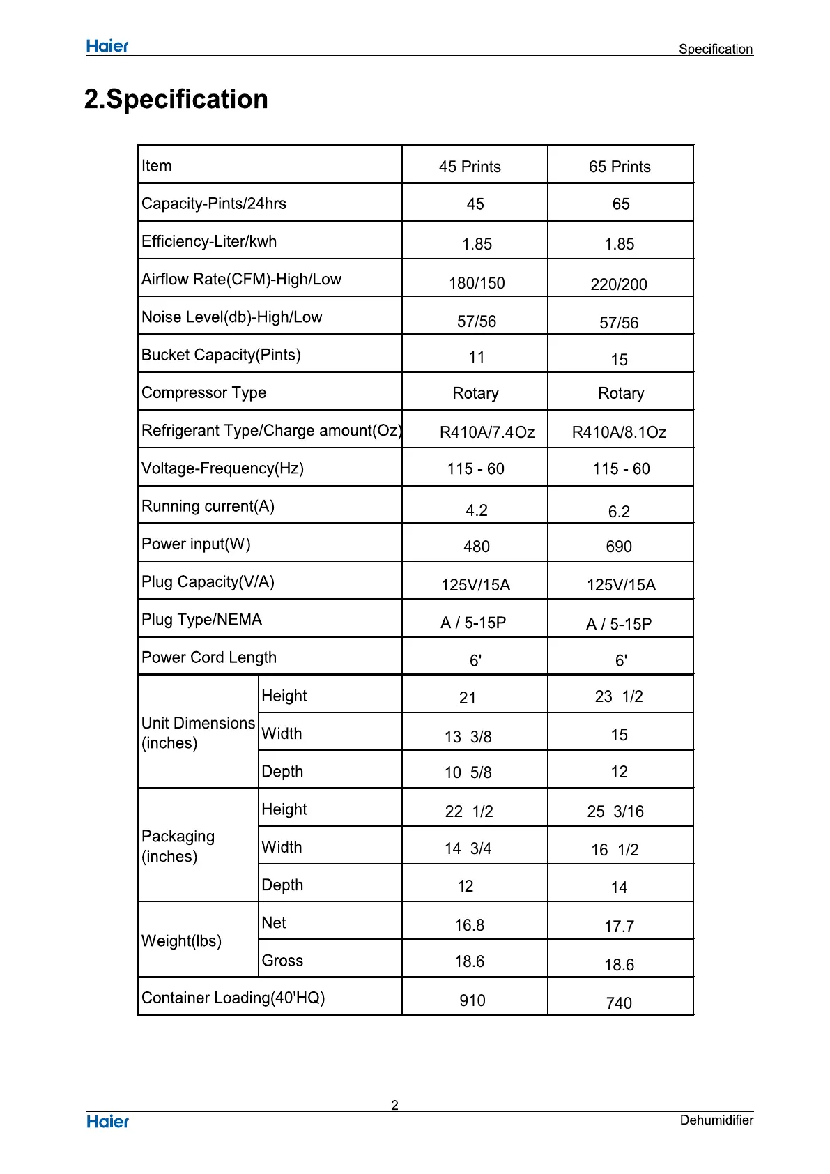 Haier DE45EM - Specifications