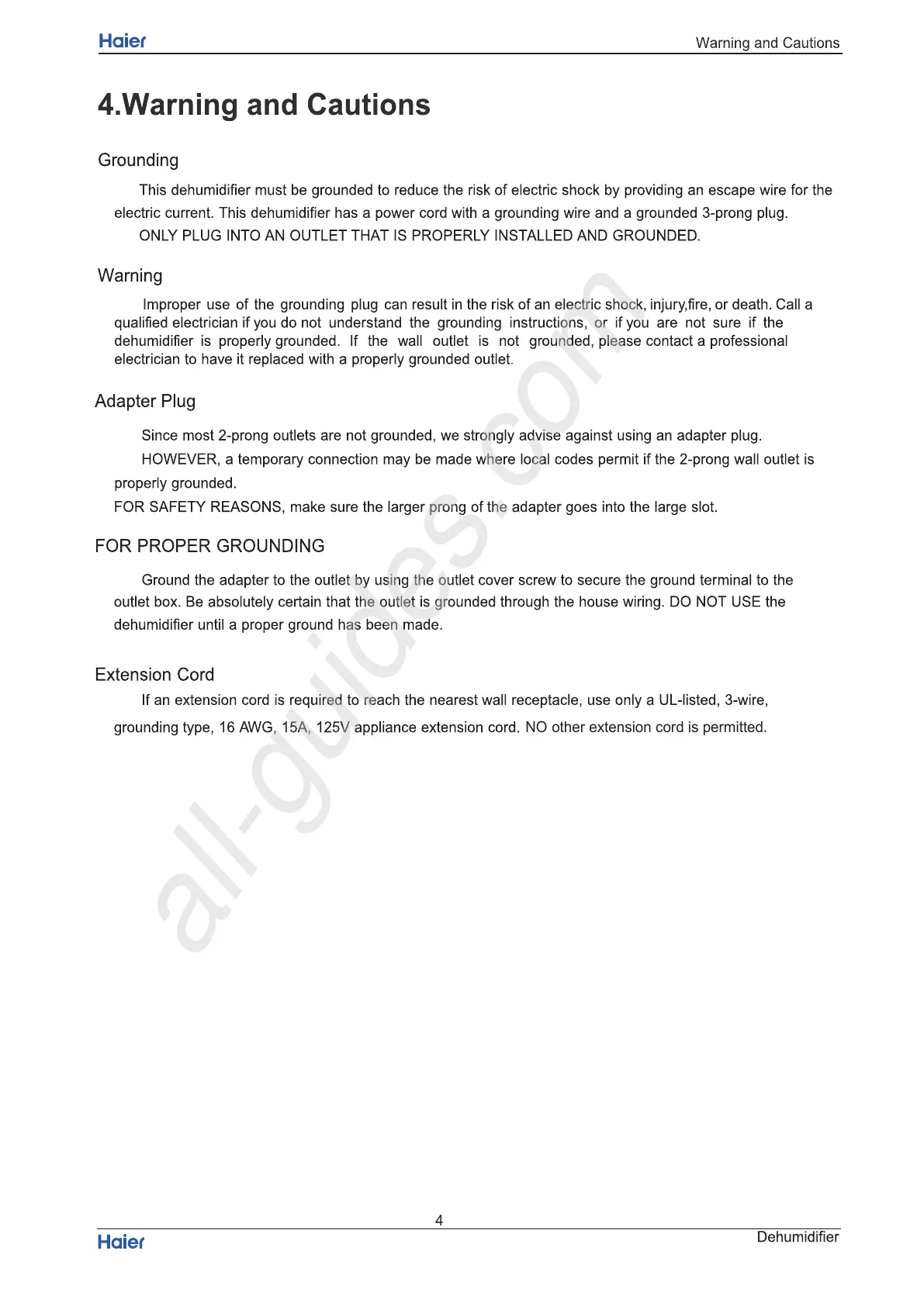 Haier DE45EM - Warning and Cautions; Grounding Requirements; Adapter Plug Usage Guidelines; Extension Cord Specifications