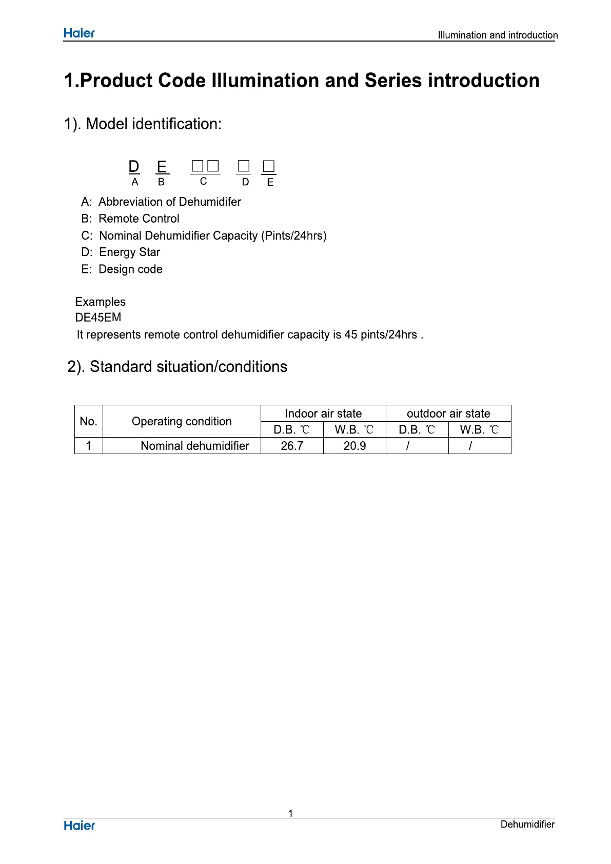 Haier DE65EM - Product Code Illumination and Series Introduction; Model Identification; Standard Situation;Conditions