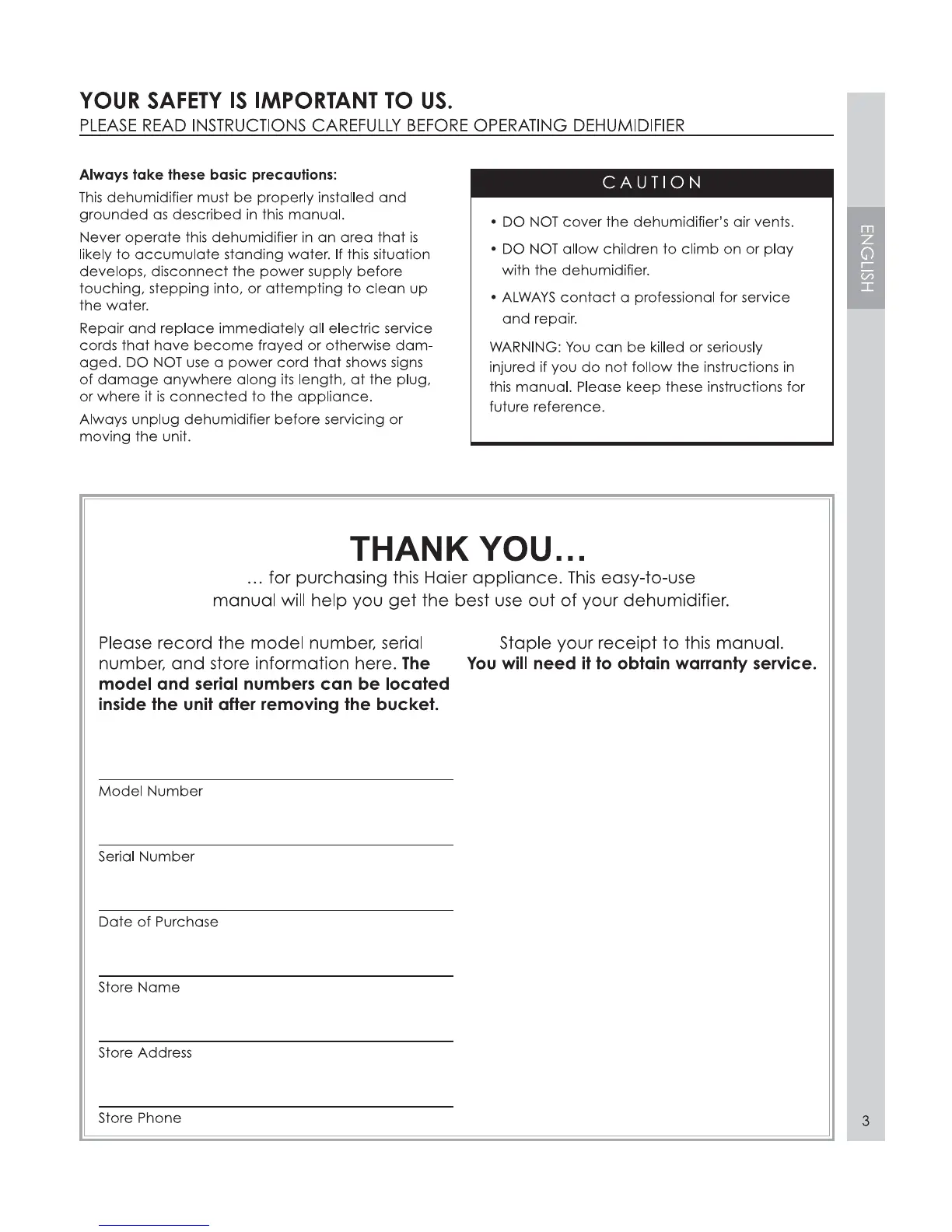 Haier DM32EK - Essential Safety Guidelines; Basic Operational Safety; Critical Warnings and Cautions; Product Information and Warranty Record