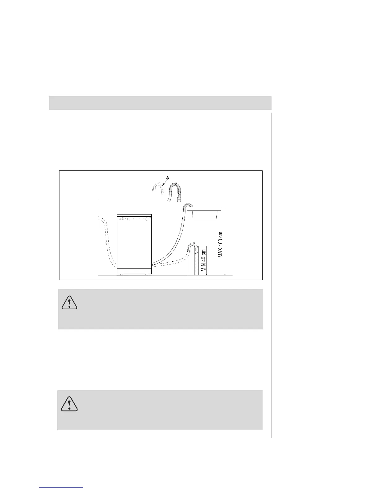 free end of the hose must be at a height between 40 and 100 cm and must not be immersed in water.