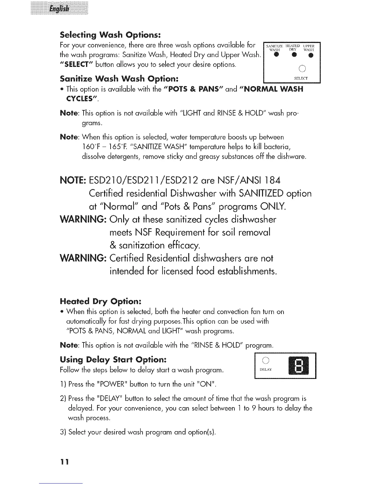 2) Pressthe "DELAY" button to select the amount of time that the wash program is