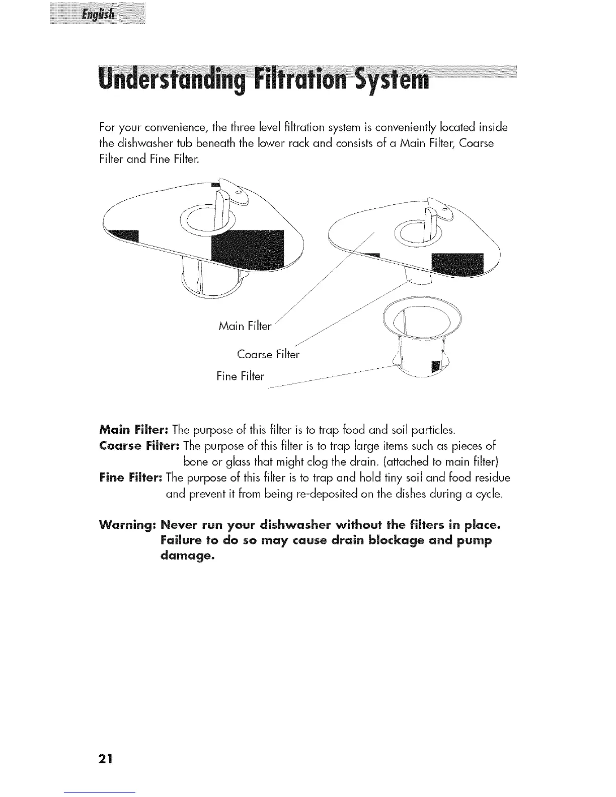 Main Fiffer: The purpose of this filter is to trap food and soil particles.