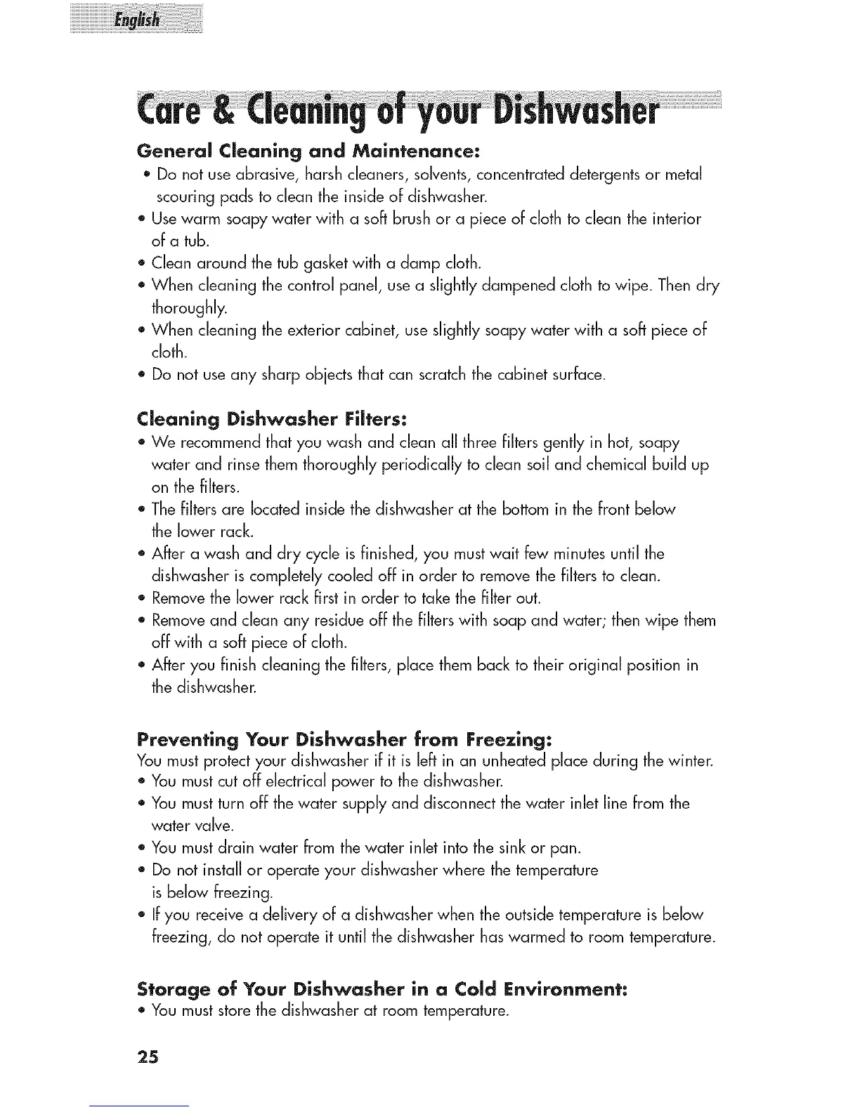 freezing,do notoperate it untilthe dishwasherhaswarmed to room temperature.