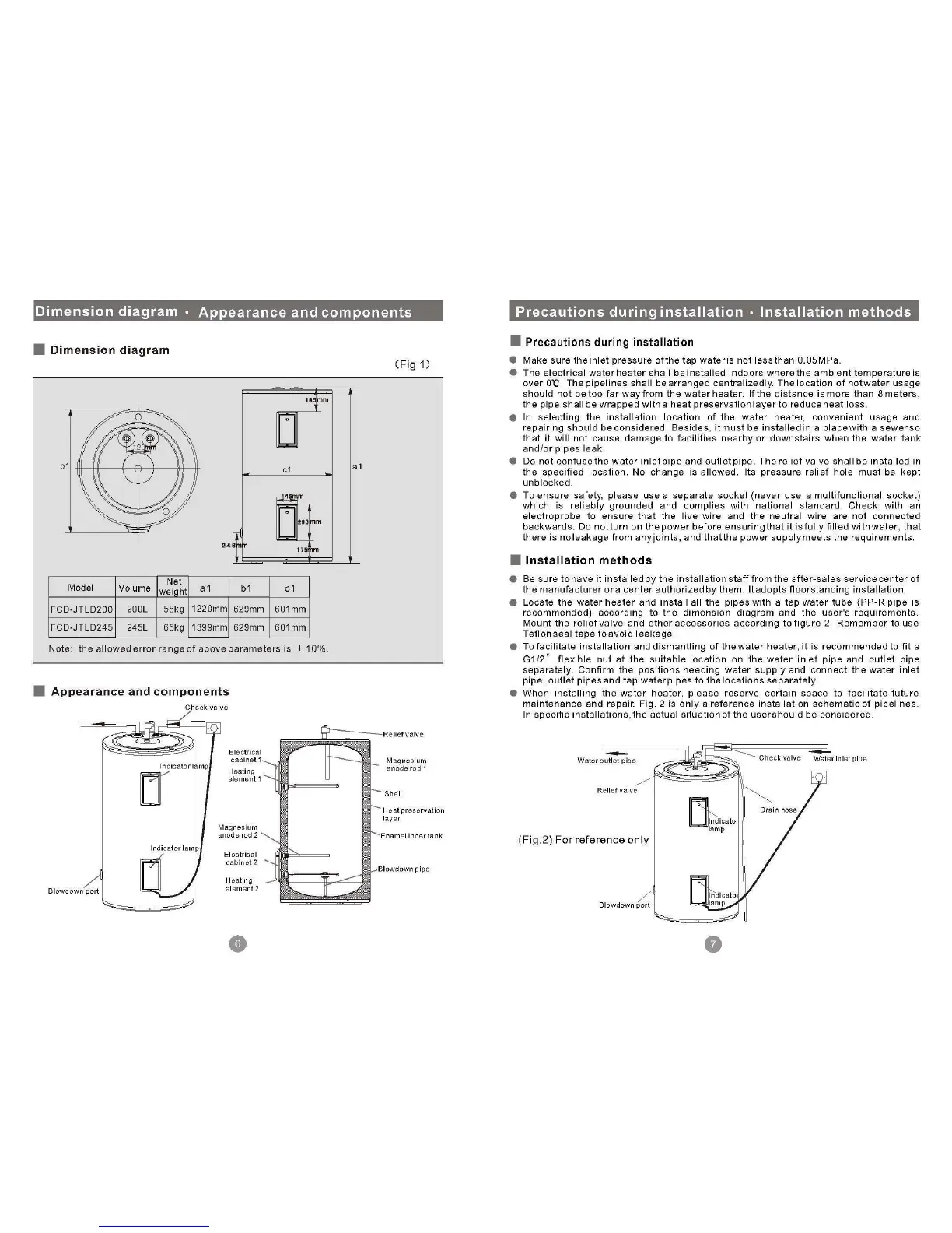 Haier FCD-JTLD200 - Dimension diagram; Appearance and components; Precautions during installation; Installation methods