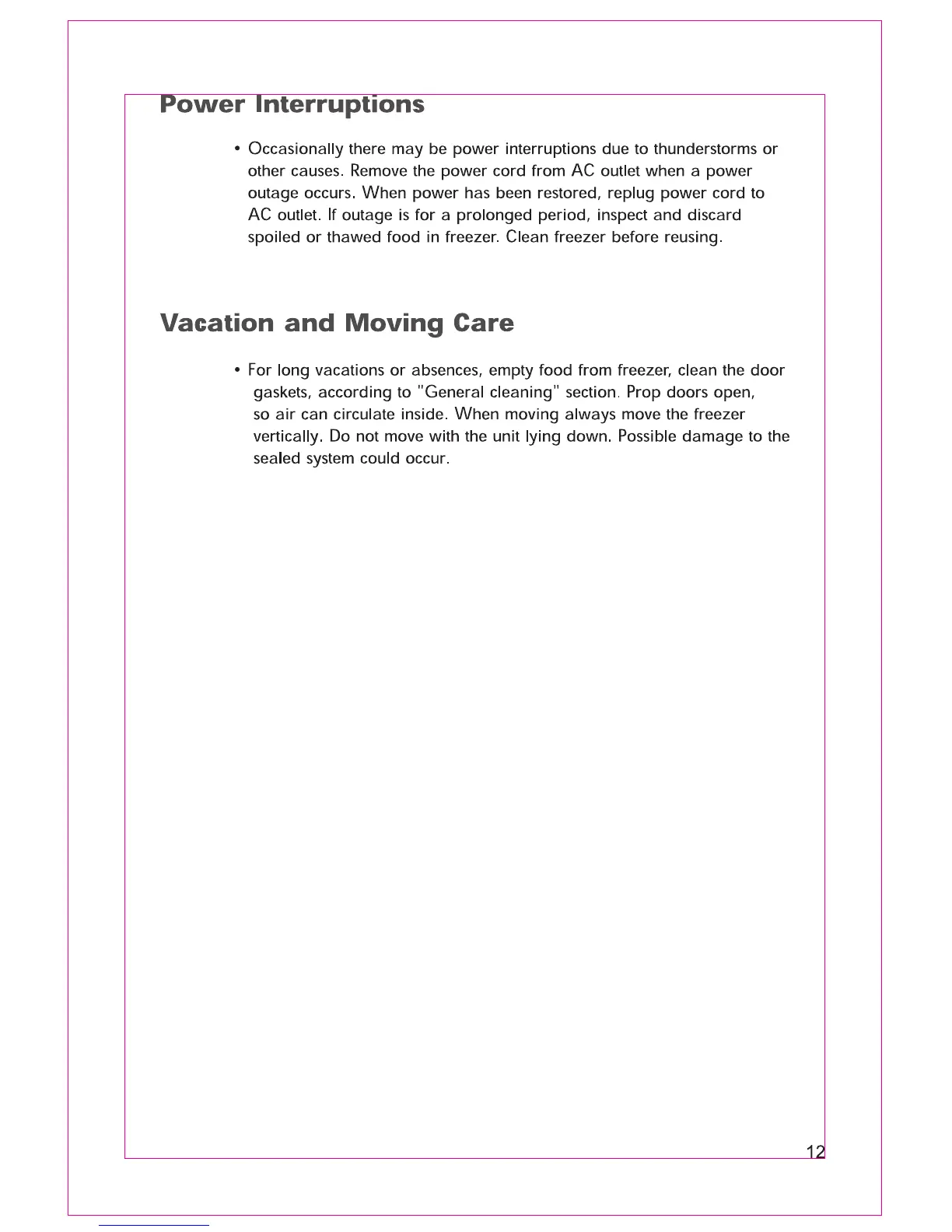 Haier HCF148A - Power Interruptions; Vacation and Moving Care