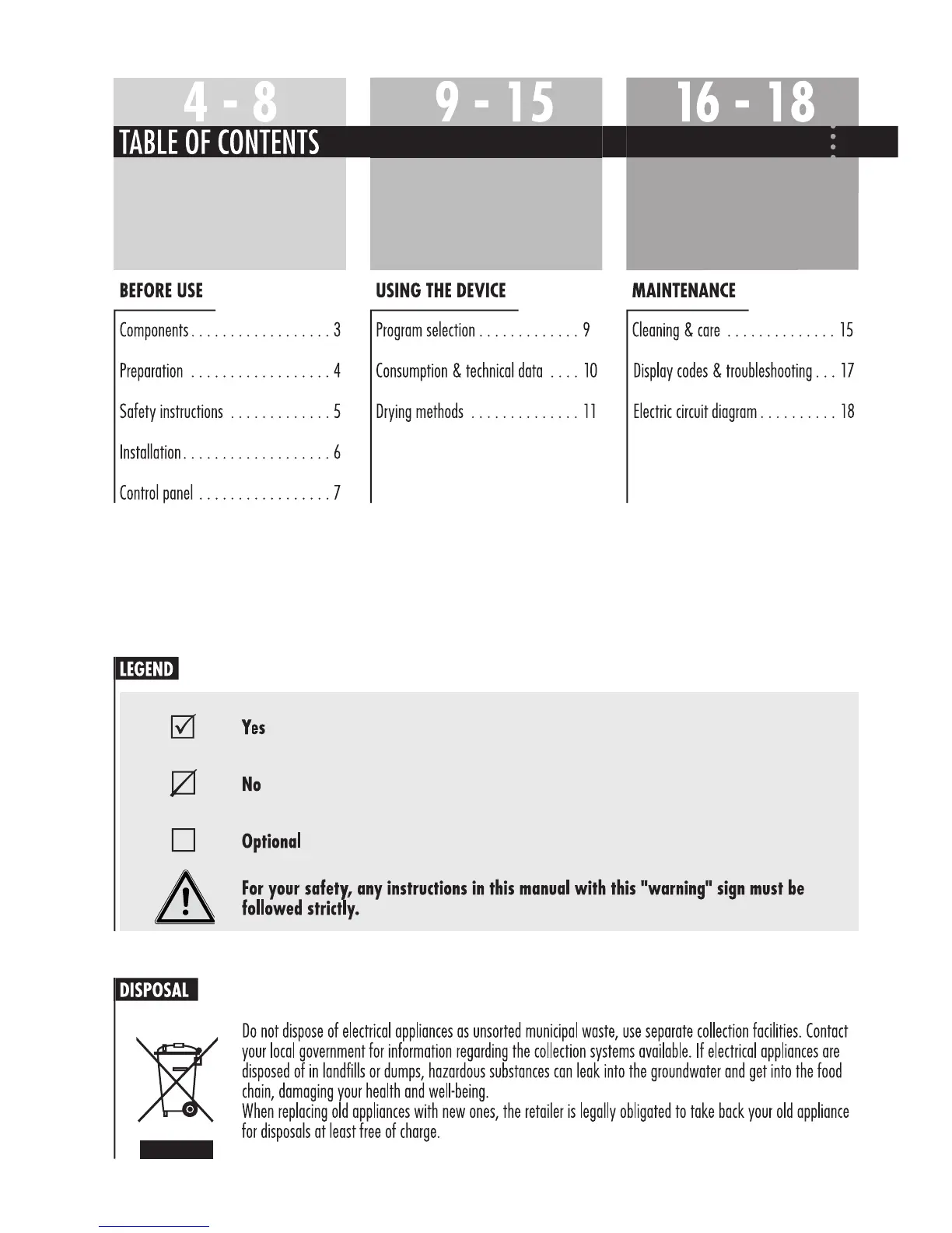 Haier HD70-01 - Table of Contents; Legend; Disposal