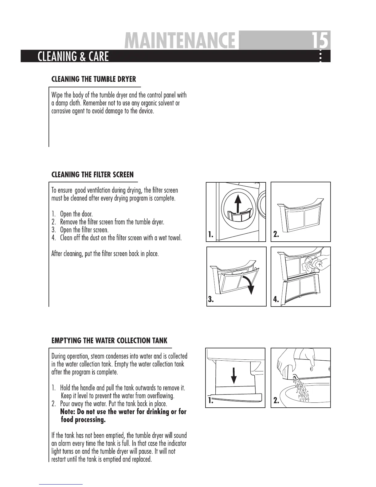 Haier HD70-01 - CLEANING & CARE; CLEANING THE TUMBLE DRYER; CLEANING THE FILTER SCREEN; EMPTYING THE WATER COLLECTION TANK