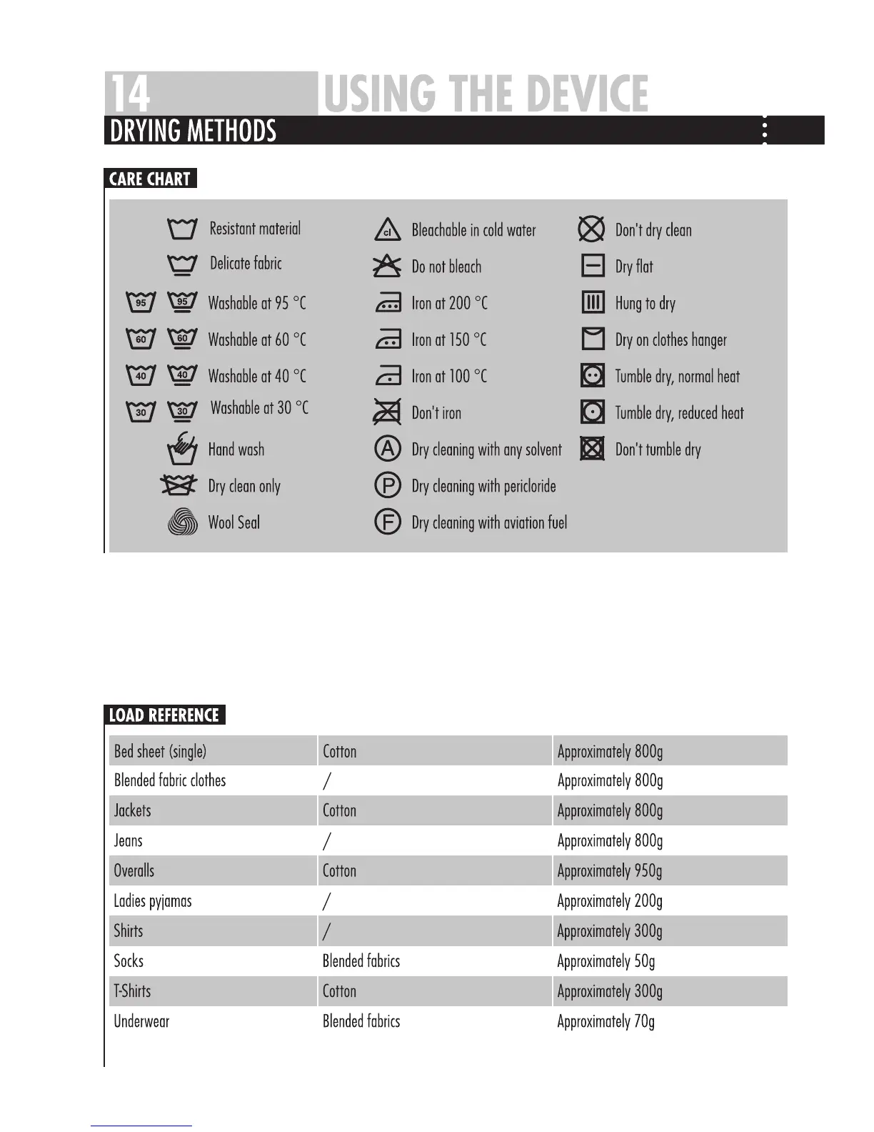 Haier HD70-79 - Care Chart; Load Reference