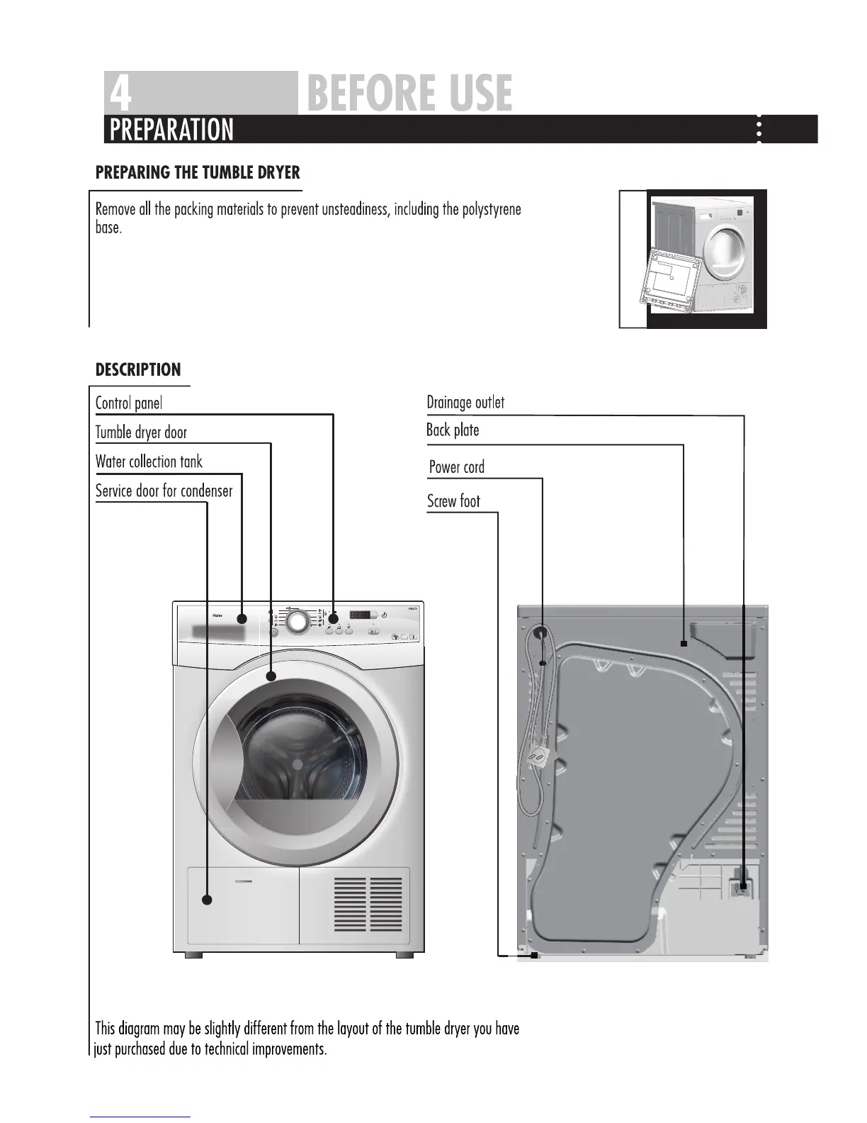 Haier HD80-79 - Preparing the Tumble Dryer; Description