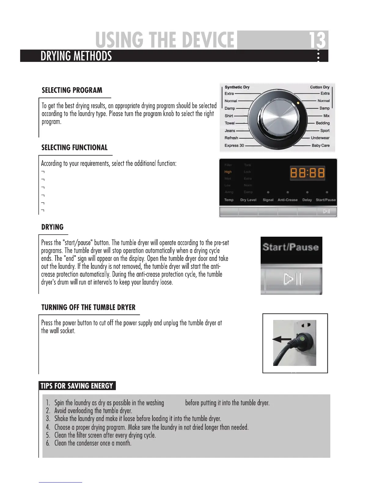 Haier HDC80E1 - Tips for Saving Energy; Selecting Program;Functional; Drying; Turning off the Tumble Dryer