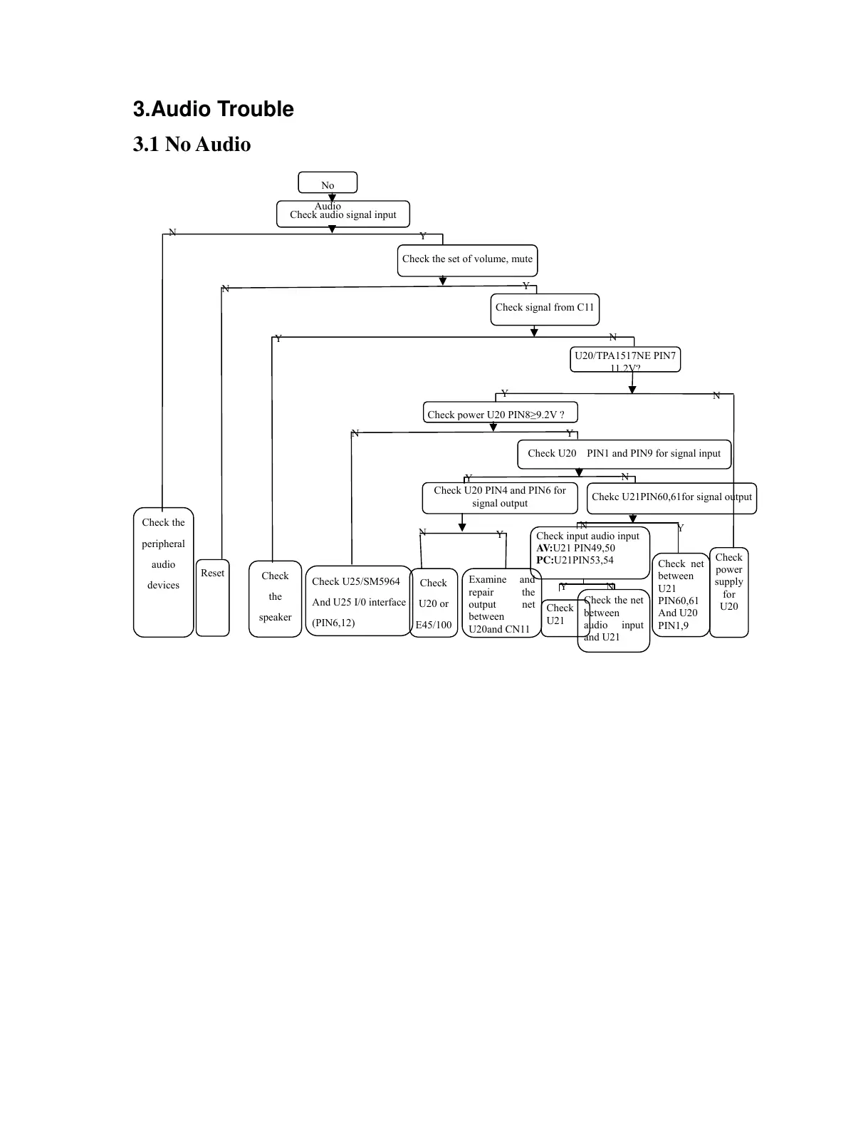 Check U20 PIN1 and PIN9 for signal input