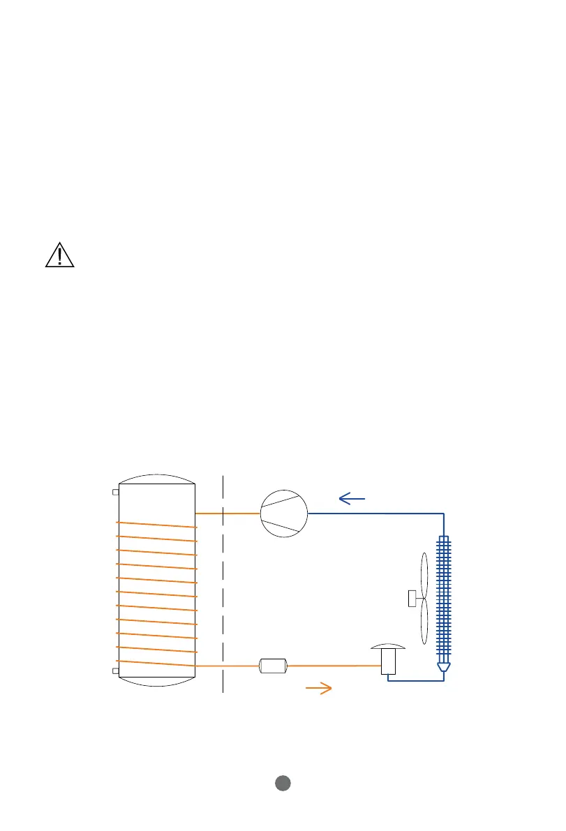 gespeicherte Wasser. Bei der Wärmeabgabe an das Wasser kühlt das Kältemittel ab,