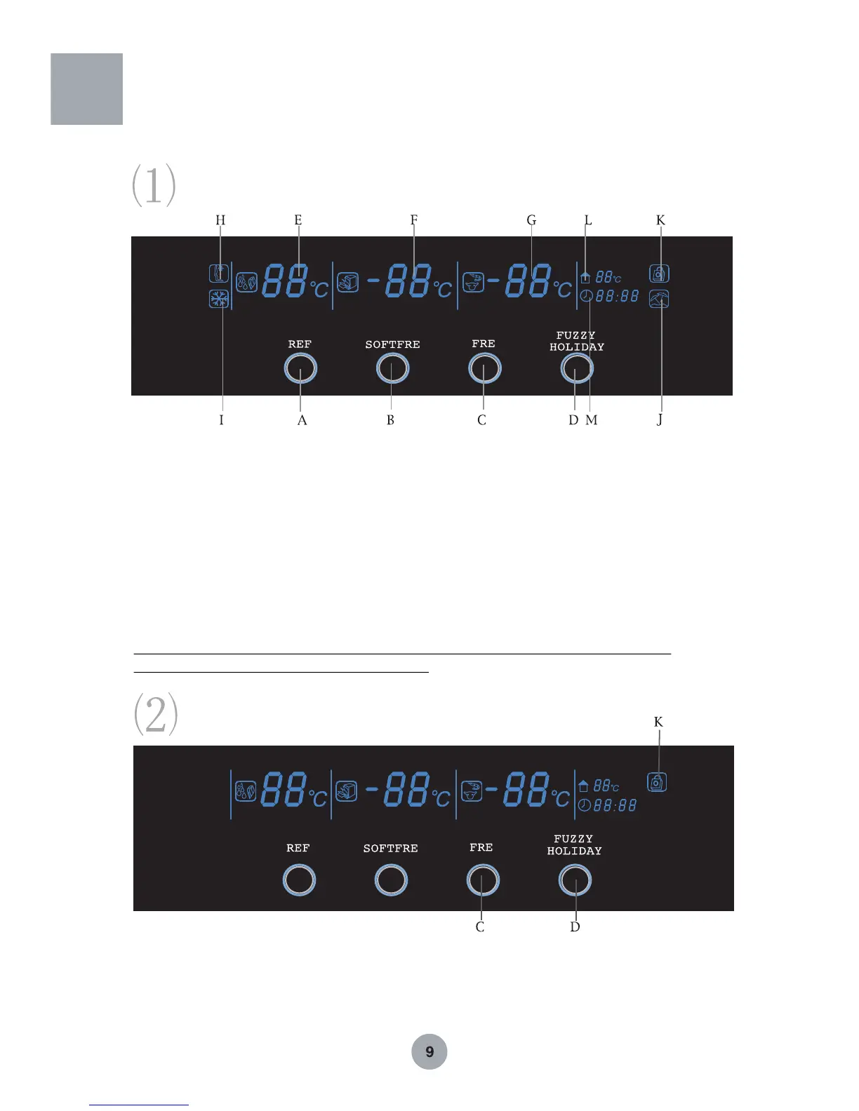 C+D Lock-on and Lock-off E. Refrigerator average temperature display