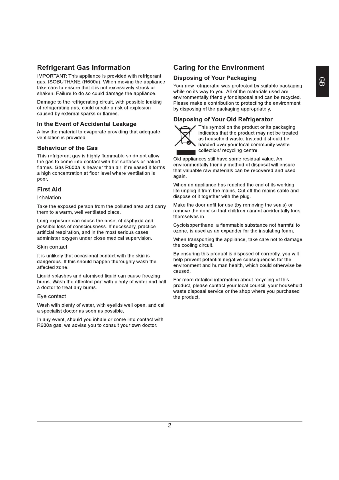 Haier HRF-618SS - Refrigerant Gas and Environment; Refrigerant Gas: Leakage and Behavior; Refrigerant Gas: First Aid Measures