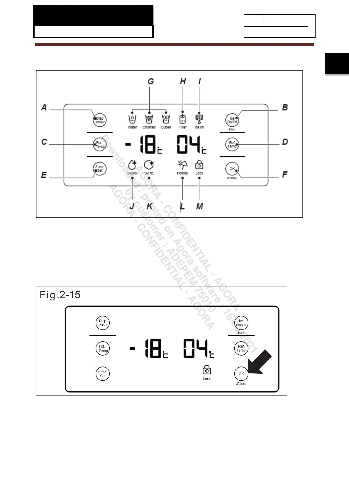 Press and hold the ‘OK’ button for 3 seconds (Fig.2-15). The LOCK icon will switch on and the refrigerator