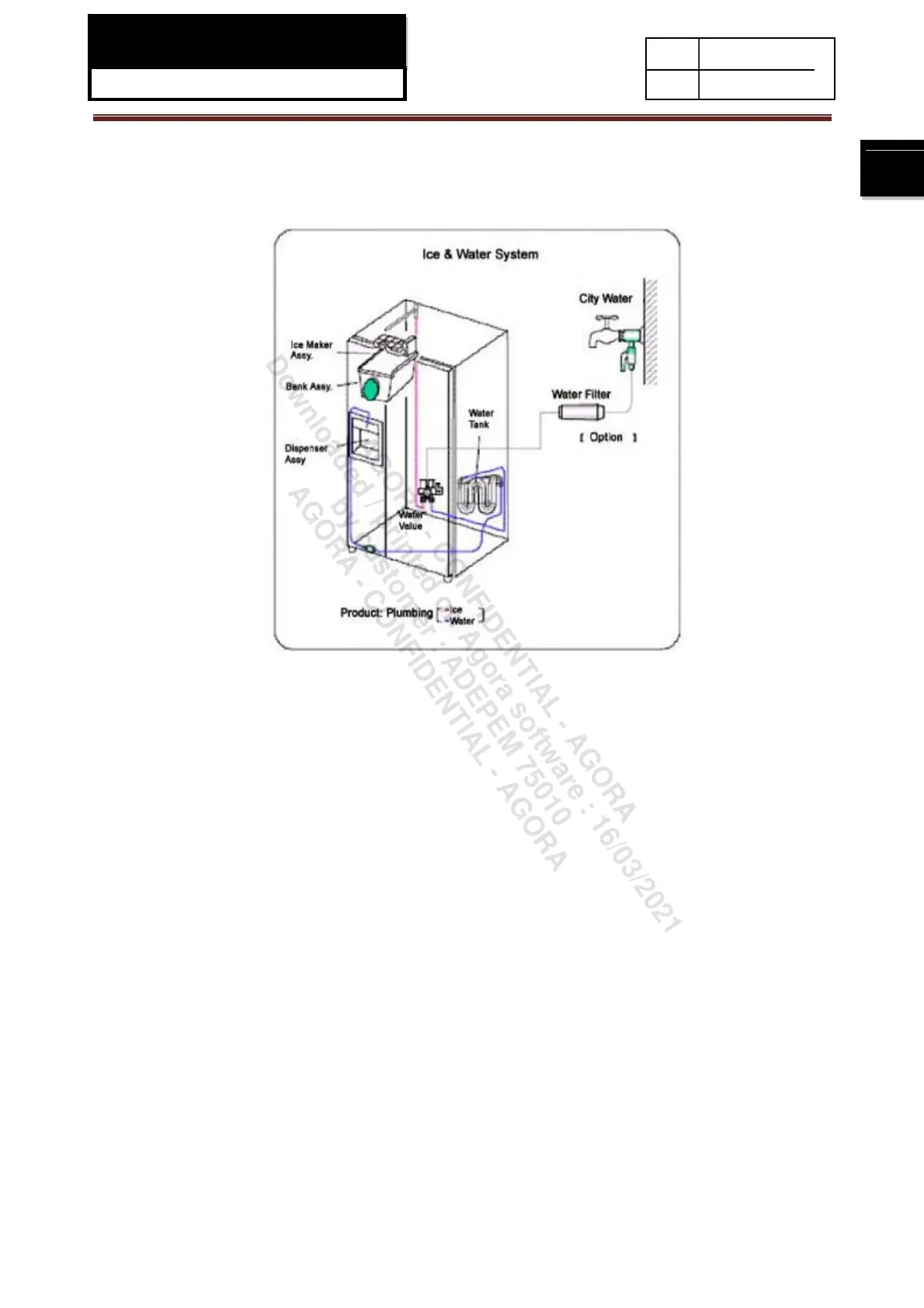 The water is divided into two ways from water valve, one way to ice-maker, and another way to water tank, then