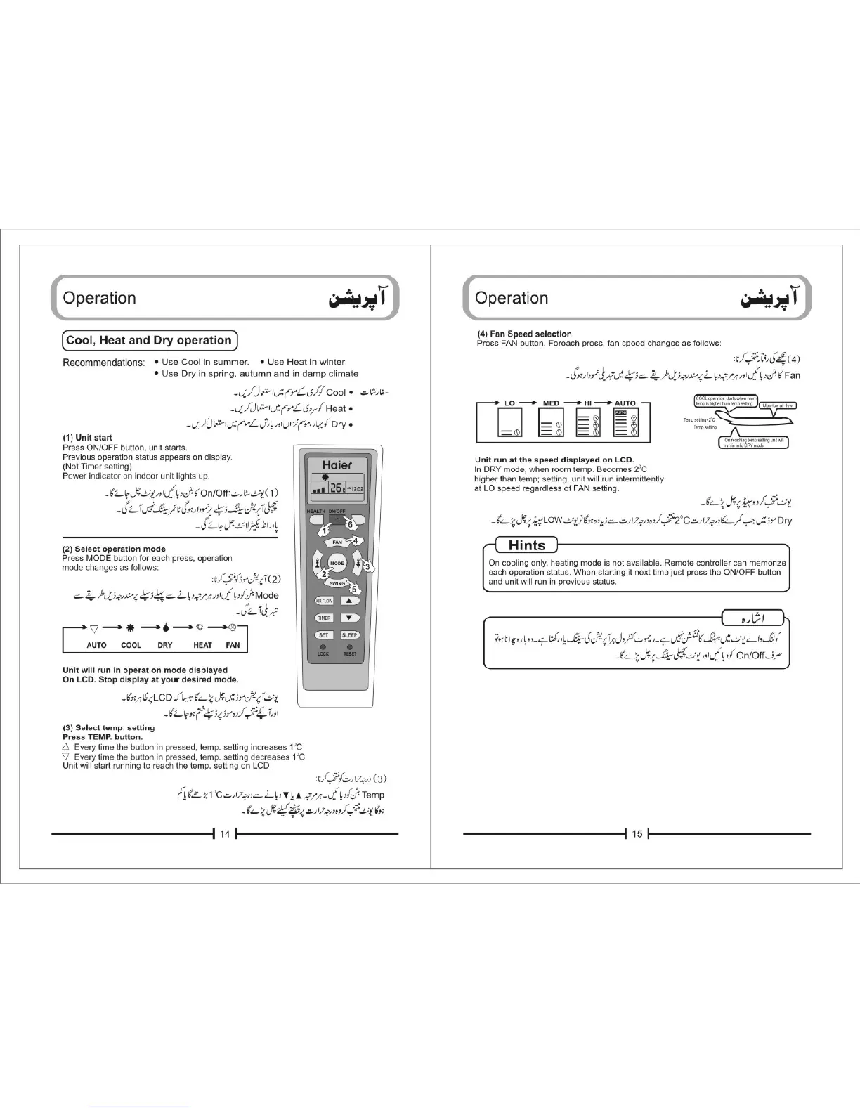 Haier HSU-12LK03 - Operation; Cool, Heat and Dry Operation; Hints