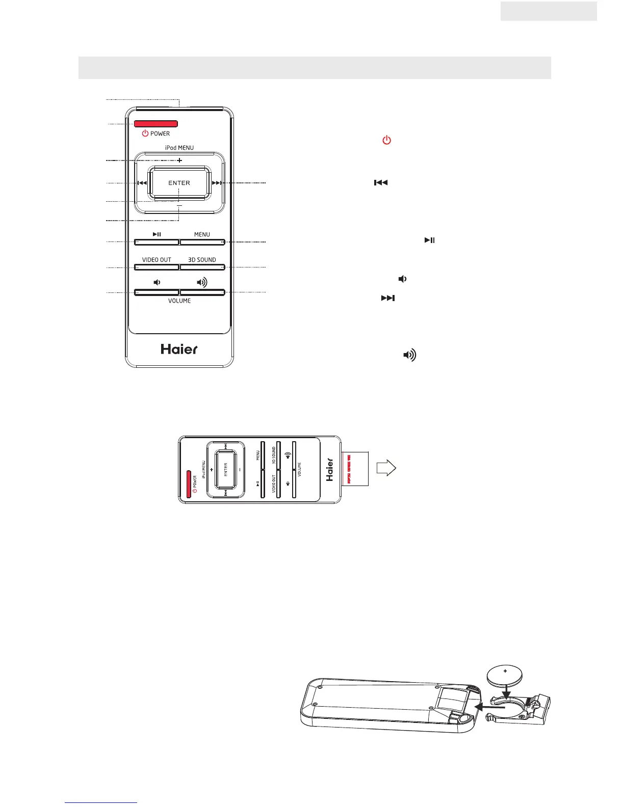battery in the holder as shown in the illustration. Slide the holder back into the remote