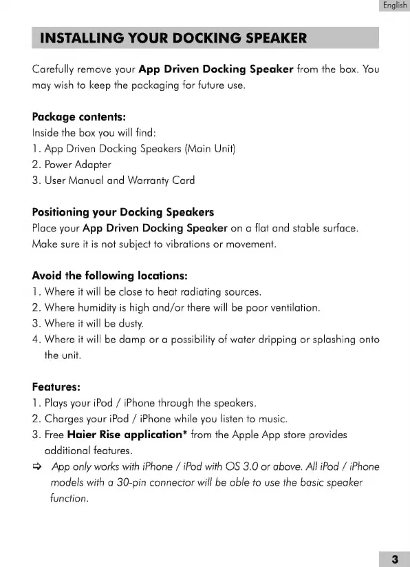 Haier IPDS-1 - Installing Your Docking Speaker; Positioning Your Docking Speakers; Avoid the Following Locations; Features