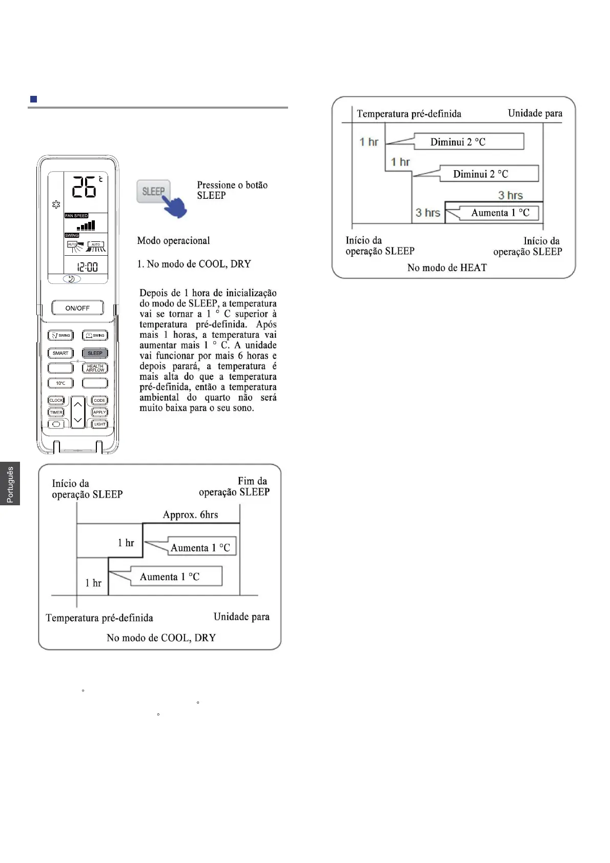 Depois de 1 hora de inicialização do modo de sono, a temperatura vai