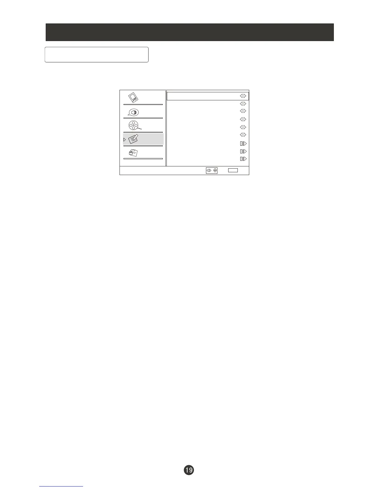 1. Press MENU button and /CH- until the following menu appears on the