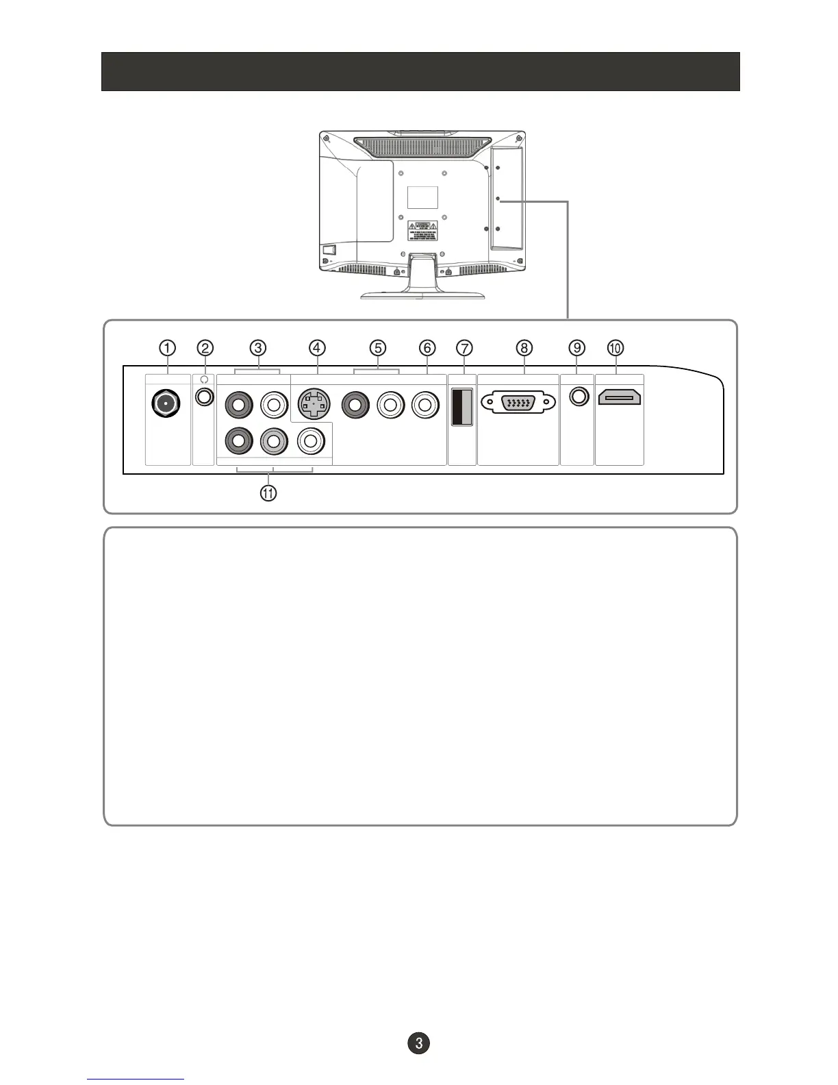 1.ANT IN(Antenna Input) Connect cable or antenna signals to the TV,